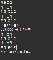 package test.aspectj.spring.di.fish; public interface Fish { String getName(); void setName(String name); //DI를 사용하기위한 변수하나와 세터를 준비한다. }package test.aspectj.spring.di.fish; public class Fishlmpl implements Fish { private String name; @Override public String getName() { // TODO Auto-generated method stub System.out.println("게터동작"); return name; } @Override public void setName(String name) { // TODO Auto-generated method stub System.out.println("세터동작"); this.name = name; } }package test.aspectj.spring.di.fish; import org.aspectj.lang.ProceedingJoinPoint; import org.aspectj.lang.annotation.Around; import org.aspectj.lang.annotation.Aspect; import org.aspectj.lang.annotation.Pointcut; @Aspect public class FishAspect { @Pointcut("execution(* get*(..))") public void sayHi() { //여기서는 출력문을 넣을 수 없음 } // @Around("sayHi()") public Object say(ProceedingJoinPoint pjp)throws Throwable{ System.out.println("전에 동작함"); Object name = pjp.proceed(); System.out.println("후에 동작함"); return name; } // @Around("execution(* set*(..))") public void validate(ProceedingJoinPoint pjp)throws Throwable{ System.out.println("setXXX 에서 동작함"); //pjp.proceed(new Object[]{"고~래!"}); //위처럼 객체를 변결 할 수 도 있다. pjp.proceed(); } }<?xml version="1.0" encoding="UTF-8"?> <beans xmlns="http://www.springframework.org/schema/beans" xmlns:xsi="http://www.w3.org/2001/XMLSchema-instance" xmlns:aop="http://www.springframework.org/schema/aop" xsi:schemaLocation="http://www.springframework.org/schema/beans http://www.springframework.org/schema/beans/spring-beans.xsd http://www.springframework.org/schema/aop http://www.springframework.org/schema/aop/spring-aop.xsd"> <aop:aspectj-autoproxy/> <!-- this is the object that will be proxied by Spring's AOP infrastructure --> <bean name="gamulchi" class="test.aspectj.spring.di.fish.Fishlmpl"> <property name="name" value="가물치"/> </bean> <bean name="gumbung" class="test.aspectj.spring.di.fish.Fishlmpl"> <property name="name" value="금붕어"/> </bean> <!-- this is the actual advice itself --> <bean id="fishAspect" class="test.aspectj.spring.di.fish.FishAspect"/> </beans>package test.aspectj.spring.di.fish; import org.springframework.beans.factory.BeanFactory; import org.springframework.context.support.ClassPathXmlApplicationContext; public class FishNameTest { public static void main(String[] args) { // TODO Auto-generated method stub BeanFactory bf = new ClassPathXmlApplicationContext("test/aspectj/spring/di/fish/aopAppContext.xml"); Fish fish1 = (Fish) bf.getBean("gamulchi"); //Fish fish2 = (Fish) bf.getBean("gumbung"); System.out.println("이름1:"+fish1.getName()); //System.out.println("이름2:"+fish2.getName()); fish1.setName("가물가물~"); //fish2.setName("금붕금붕~"); System.out.println("바뀐이름1:"+fish1.getName()); //System.out.println("바뀐이름2:"+fish2.getName()); } }