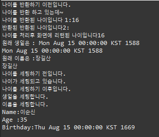 package test.aspectj.spring.aop; import java.util.GregorianCalendar; import org.aspectj.lang.annotation.After; import org.aspectj.lang.annotation.AfterReturning; import org.aspectj.lang.annotation.Aspect; import org.aspectj.lang.annotation.Before; @Aspect public class MannerAOP { @Before("execution(* set*(String))") public void confirmName() { System.out.println("이름을 세팅합니다."); } @Before("execution(* set*(java.util.GregorianCalendar))") public void confirmBirthday() { System.out.println("생일을 세팅합니다."); } @Before("execution(* set*(int))") public void copfirmAge() { System.out.println("나이를 세팅하기 전입니다."); } @After("execution(* set*(int))") public void confirmAge2(){ System.out.println("나이를 세팅하기 이후입니다."); } @Before("execution(* getAge(..))") public void confirmBeforeSettingAge1() { System.out.println("나이를 반환하기 이전입니다."); } @AfterReturning(returning="age", value="execution(* getAge(..))") public void confirmBeforeSettingAge2(int age) { System.out.println("나이를 반환된 나이입니다 1:" +age); } @After("execution(* getAge(..))") public void confrimBeforeSettingAge123() { System.out.println("반환된 반환된 나이입니다2:"); } @AfterReturning(returning = "name", value = "execution(* getName(..))") public void confirmBeforeSettingName2222(String name) { System.out.println("원래 이름은 :" + name); } @AfterReturning(returning = "date", value="execution(* getBirthday(..))") public void confirmBeforeSettingDate3333(GregorianCalendar date) { System.out.println("원래 생일은 : " +date.getTime()); } }package test.aspectj.spring.aop; import java.util.GregorianCalendar; public interface Hero { public int getAge(); public void setAge(int age); public GregorianCalendar getBirthday(); public void setBirthday(GregorianCalendar birthday); public String getName(); public void setName(String name); }package test.aspectj.spring.aop; import java.util.GregorianCalendar; public class JangGilSan implements Hero { String name; int age; GregorianCalendar birthday; private JangGilSan() { name="장길산"; age = 16; birthday= new GregorianCalendar(1588, 7, 15); } public String getName() { return name; } public void setName(String name) { this.name = name; } public int getAge() { System.out.println("나이를 반환 하고 있는데~"); return age; } public void setAge(int age) { this.age = age; System.out.println("나이가 세팅되고 있습니다."); } public GregorianCalendar getBirthday() { return birthday; } public void setBirthday(GregorianCalendar birthday) { this.birthday = birthday; } @Override public String toString() { return "Name:"+name+"\nAge :" +age+ "\nBirthday:"+birthday.getTime(); } }<?xml version="1.0" encoding="UTF-8"?> <beans xmlns="http://www.springframework.org/schema/beans" xmlns:xsi="http://www.w3.org/2001/XMLSchema-instance" xmlns:aop="http://www.springframework.org/schema/aop" xsi:schemaLocation="http://www.springframework.org/schema/beans http://www.springframework.org/schema/beans/spring-beans.xsd http://www.springframework.org/schema/aop http://www.springframework.org/schema/aop/spring-aop.xsd"> <!-- 자동으로 설정함 --> <aop:aspectj-autoproxy/> <bean id="jgs" class="test.aspectj.spring.aop.JangGilSan"/> <bean id="mannerOAP" class="test.aspectj.spring.aop.MannerAOP"/> </beans>package test.aspectj.spring.aop; import java.util.GregorianCalendar; import org.springframework.beans.factory.BeanFactory; import org.springframework.context.support.ClassPathXmlApplicationContext; public class TestFirstAOP { public static void main(String[] agrs) { BeanFactory bf = new ClassPathXmlApplicationContext("test/aspectj/spring/aop/aopAppContext.xml"); Hero human = (Hero) bf.getBean("jgs"); System.out.println("나이를 처리후 화면에 리턴된 나이입니다" + human.getAge()); System.out.println(human.getBirthday().getTime()); System.out.println(human.getName()); human.setAge(35); human.setBirthday(new GregorianCalendar(1669, 7, 15)); human.setName("이순신"); System.out.println(human); } }