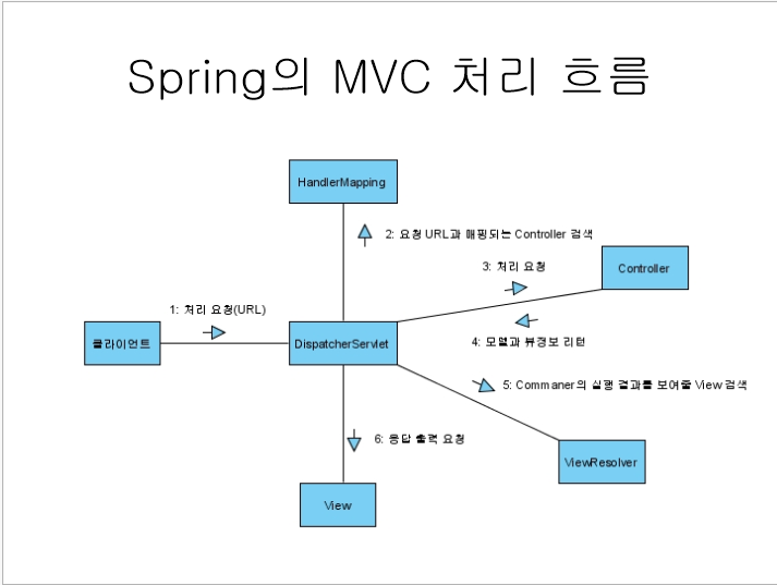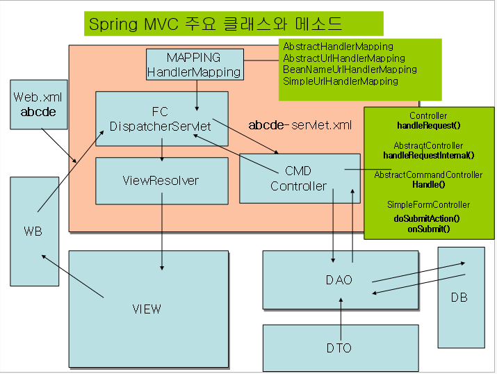 클라이언트와 디스패쳐서블릿 매핑 -- Web.xmlHandlerMapping / VierResolver --스프링xml 매핑Controller -- 액션클래스